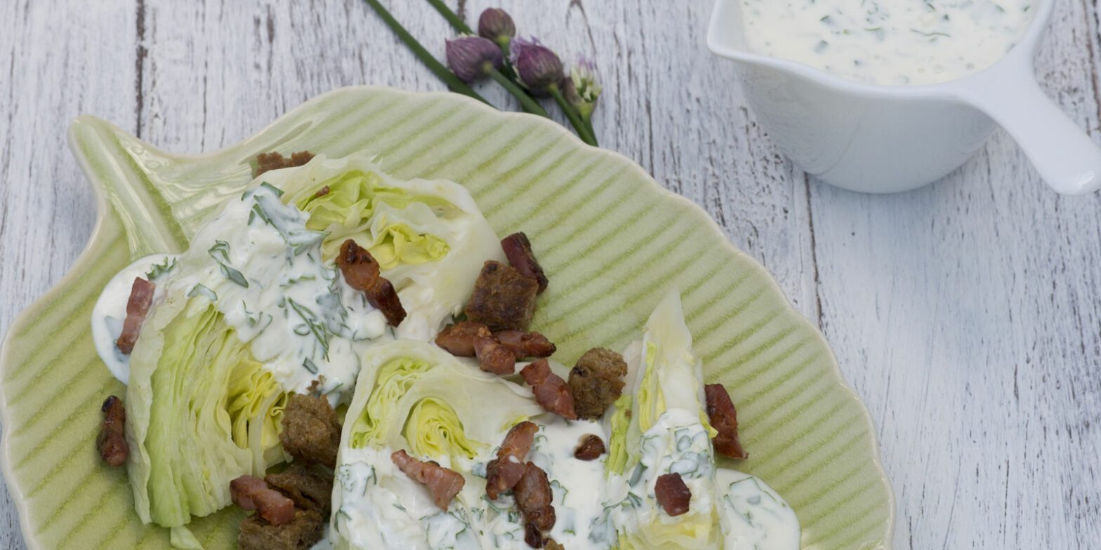 - Den Eisbergsalat in acht Teile schneiden und zwei Teile auf jedem Teller anrichten; die Speckwürfel und Croûtons darüber verteilen und mit der Kräutersauce übergießen.