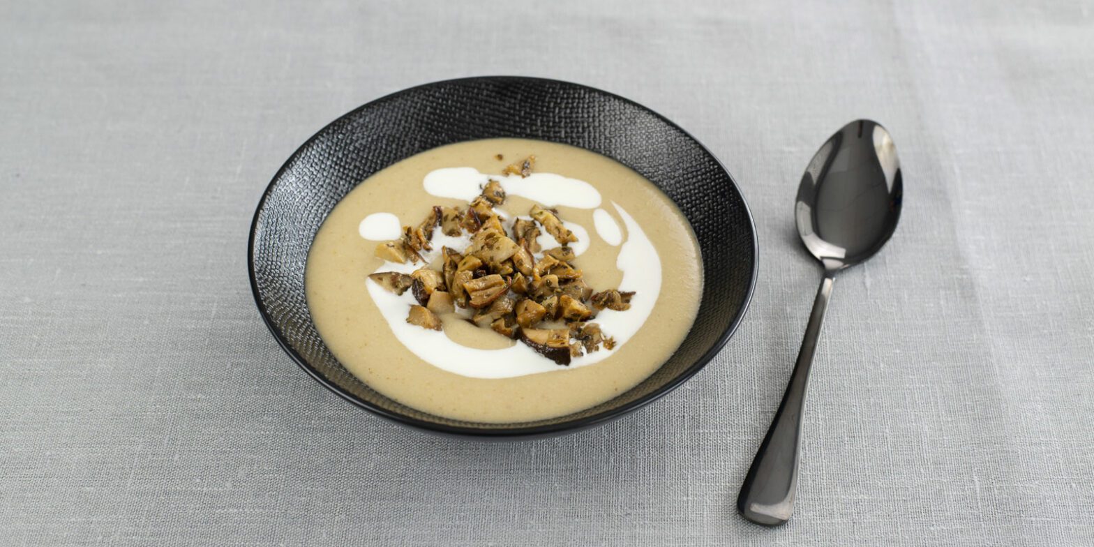 7. Die Kartoffelmischung fein pürieren. Die Cremesuppe in die Teller füllen, etwas H-Kochsahne hinzugeben und etwas unterrühren. Mit den beiseite gestellten Pilzen dekorieren.