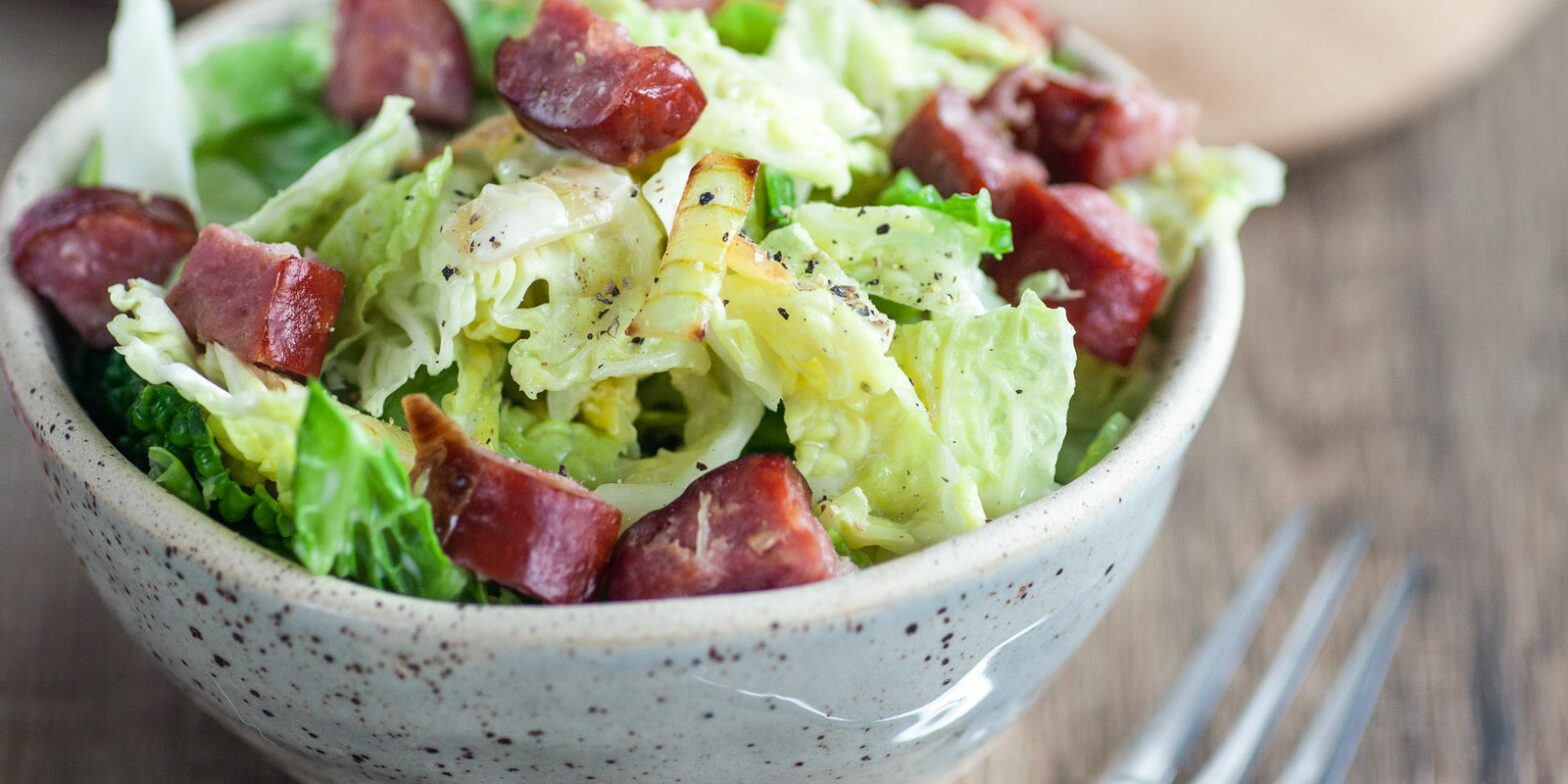 - Add the cabbage, pear pieces, single cream and stock to the onion-sausage mixture in the pan. Leave to simmer for about 15 minutes. Season with salt and black pepper. Arrange in a bowl and serve with a slice of bread or steamed potatoes.
