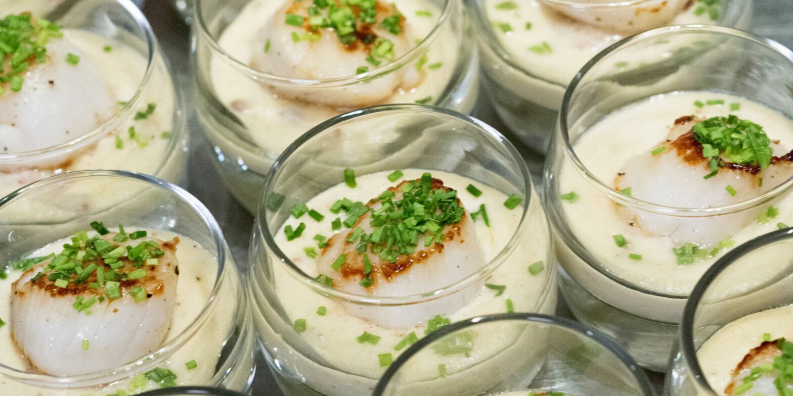 - Divide the sauce into 12 small bowls or jars, placing a rasher of bacon in each one. Place a scallop on top and garnish with chives. Serve with mini forks or snail forks.