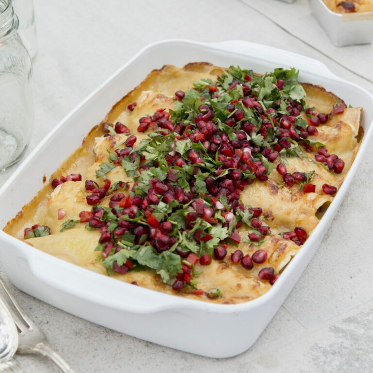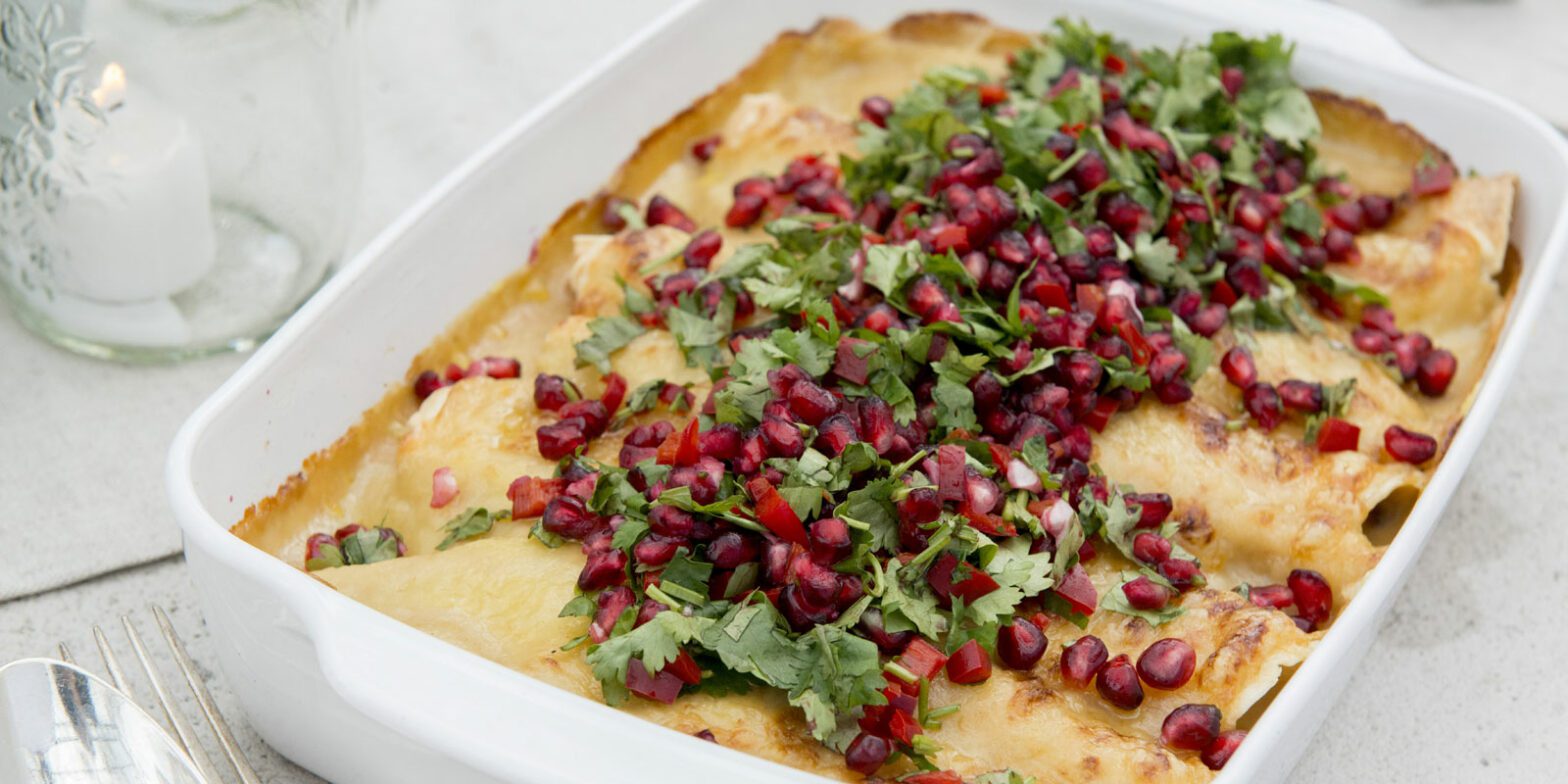 7. Lavez et épépinez les piments. Hachez-les finement ainsi que la coriandre. Retirez les graines de la grenade. Mélangez les ingrédients dans un bol et décorez-en les enchiladas avant de servir.