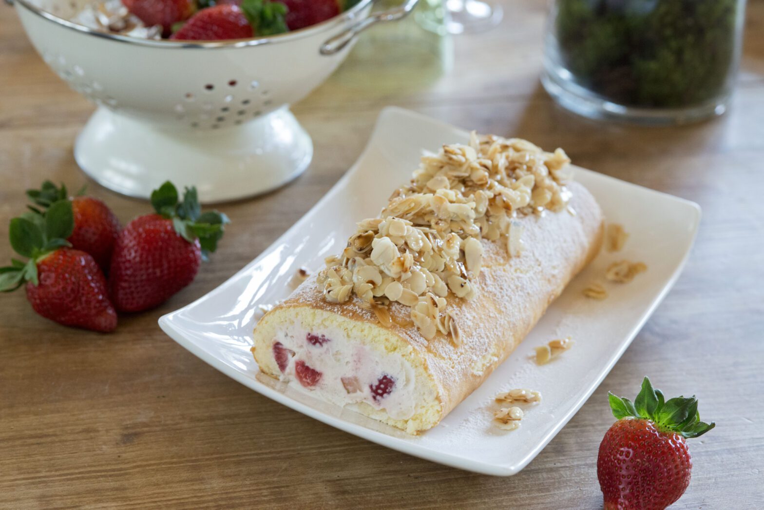 - Grillez les amandes effilées dans une poêle chaude, réservez-les. Faites fondre une noix de beurre puis badigeonnez-en le biscuit roulé. Saupoudrez avec les amandes grillées.
