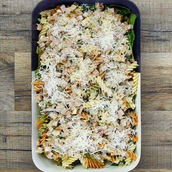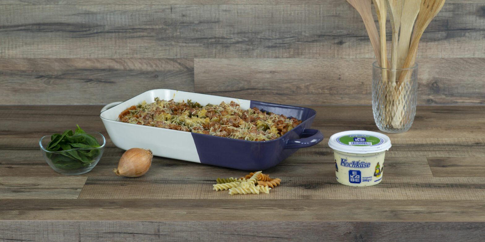 5. Répartissez les épinards sur le dessus puis recouvrez avec la deuxième moitié des pâtes. Ajoutez la préparation au Kochkäse et au jambon. Finissez en saupoudrant avec la chapelure et le parmesan râpé.