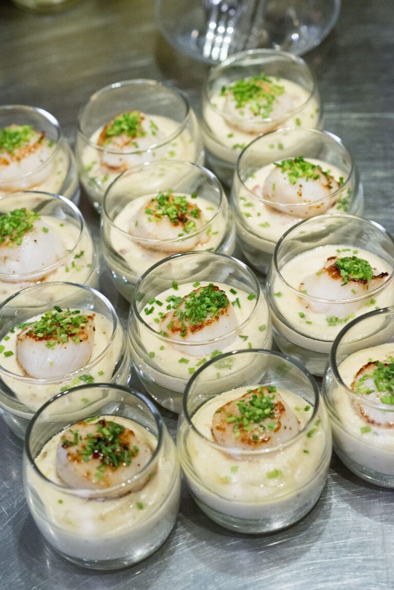 4. Répartissez la sauce dans 12 petits bols ou verrines en plaçant une tranche de lard dans chaque. Placez une noix de Saint-Jacques sur le dessus et décorez de ciboulette. Servez avec des mini-fourchettes ou piques à escargots.