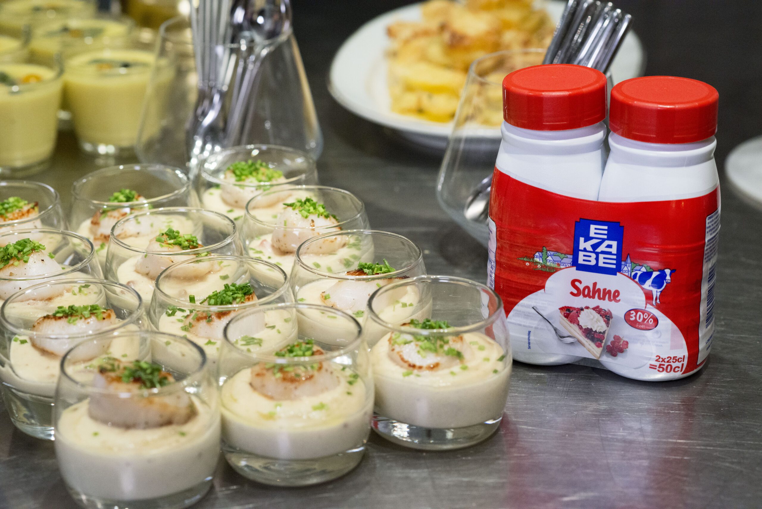 3. Passez brièvement les noix de Saint-Jacques sous l’eau froide et placez-les entre deux feuilles de papier absorbant pour bien les sécher. Faites chauffer l’huile d’olive dans une seconde poêle, déposez-y les noix de Saint-Jacques, salez, poivrez et laissez-les rôtir entre 1 à 2 minutes sur chaque face, jusqu’à ce qu’elles prennent une légère coloration brun-doré. Retirez-les de la poêle et déposez-les dans un plat sur du papier absorbant.