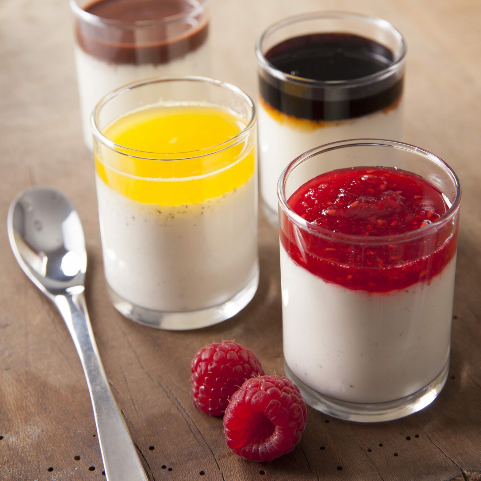 - Au moment de servir, ajoutez le coulis préparé au- dessus de chaque verrine de Panna cotta ou servez-la démoulée nappée de son coulis.