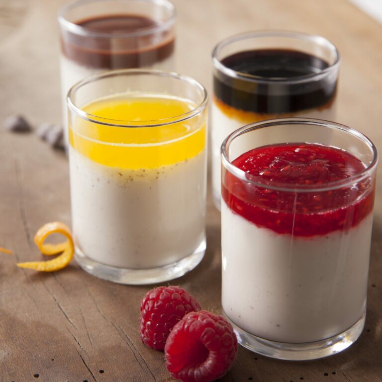 - Remplissez les verrines avec la préparation. Placez-les au réfrigérateur pour 4 heures au minimum car c’est le temps nécessaire pour que la Panna cotta durcisse. Pour un dressage « façon entremets » avec un coulis de votre choix, préférez des ramequins rincés préalablement à l’eau froide ou placés un court instant au réfrigérateur – le démoulage n’en sera que plus facile.